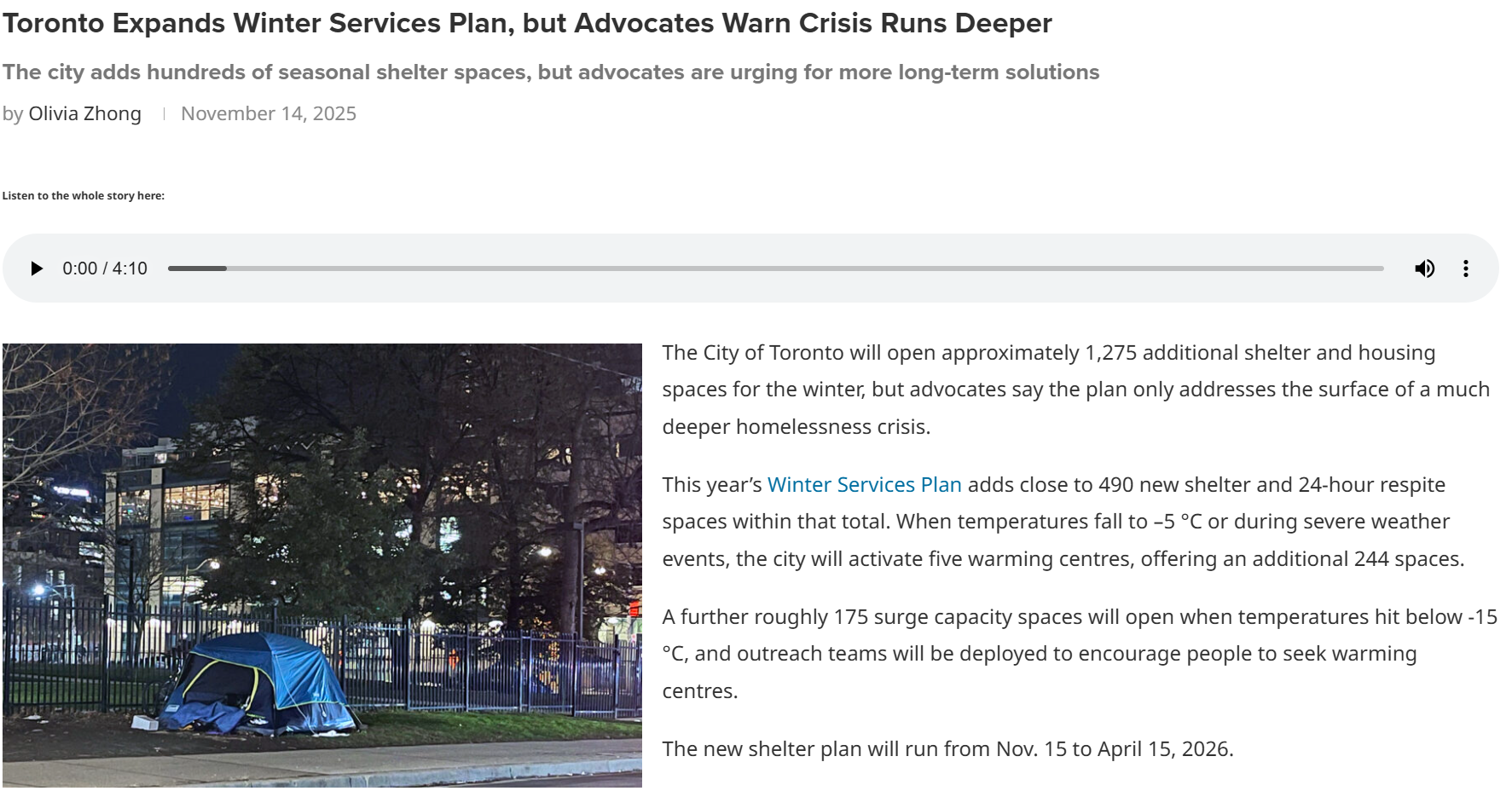 PRESS: “Toronto Expands Winter Services Plan, but Advocates Warn Crisis Runs Deeper”